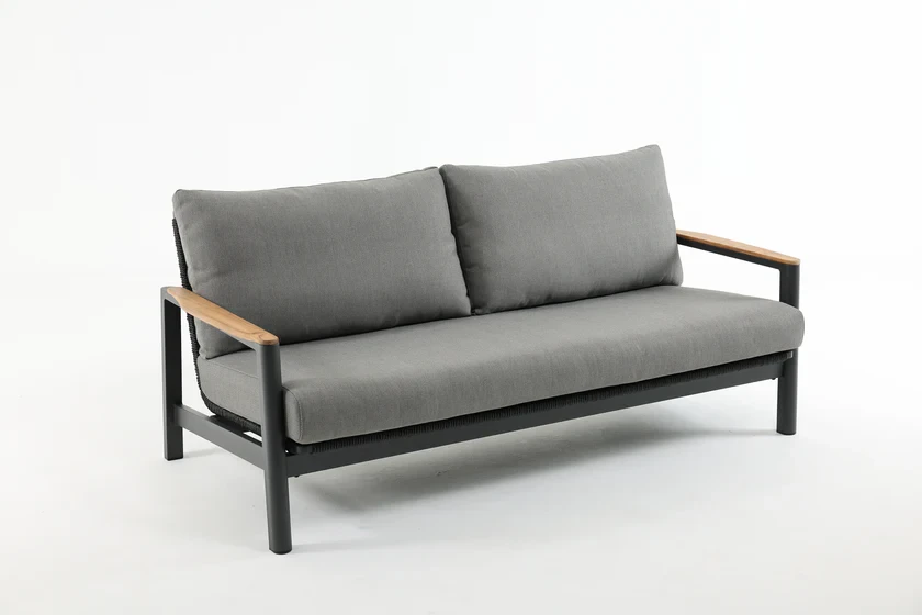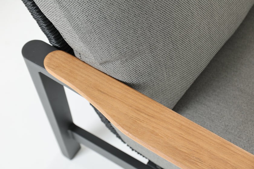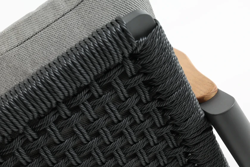 Meticulously crafted with marine-grade aluminum frames, high-density polyethylene wicker, and eco-friendly materials, the set is designed to endure the elements without compromising on style. Cushioned with high-resilience foam and finished with 100% solution-dyed Olefin fabric, each seat offers plush comfort while resisting fading, water, and mildew. The set features solid teak wood armrests for a warm, natural touch, seamlessly paired with the sleek fog-gray sintered stone coffee table that balances aesthetics and practicality.