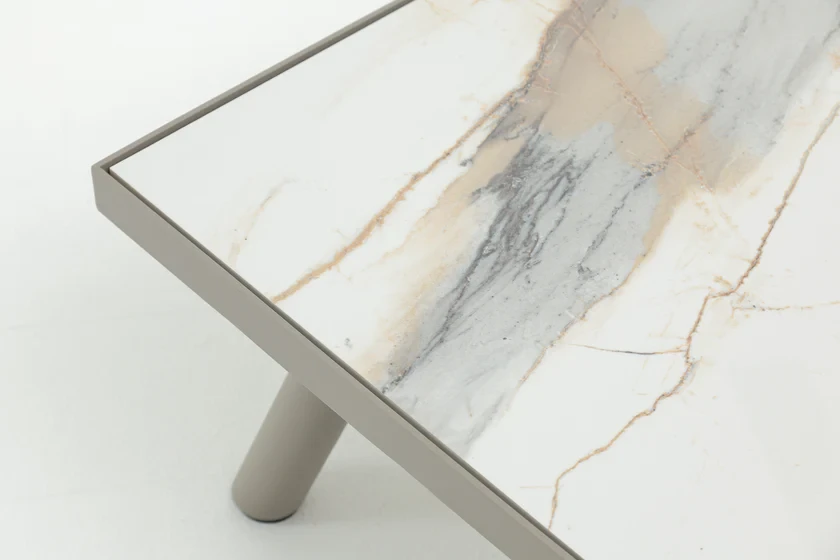 The rectangular design features a luxurious QUADRA Sintered Stone tabletop in an eye-catching Calacatta Gold finish, offering unparalleled resistance to scratches, stains, and weather elements. Its surface is not only heatproof and UV-resistant but also food-safe, providing both enduring beauty and practicality. Designed to withstand the outdoors, the table’s lightweight aluminum frame with Axalta® powder coating ensures corrosion resistance and long-lasting durability, perfect for any season.