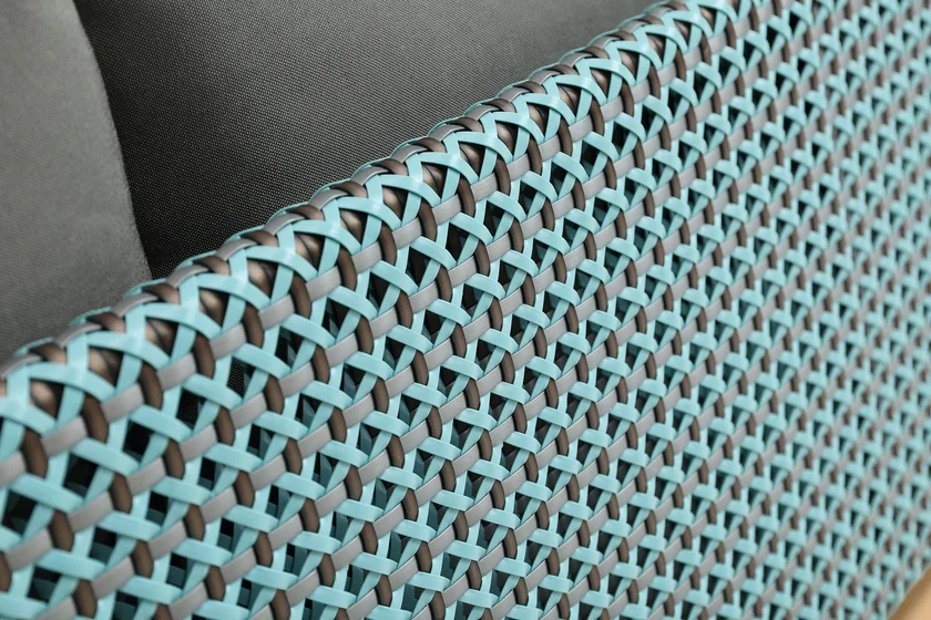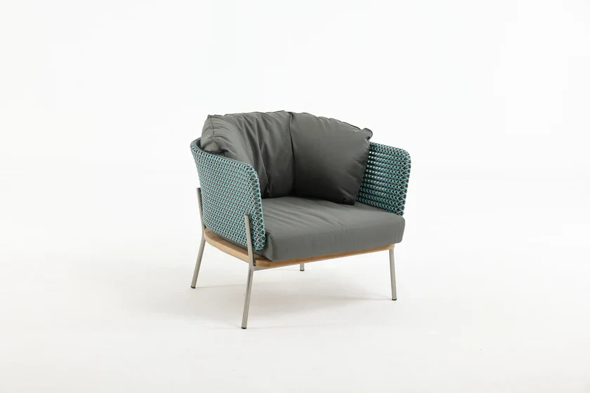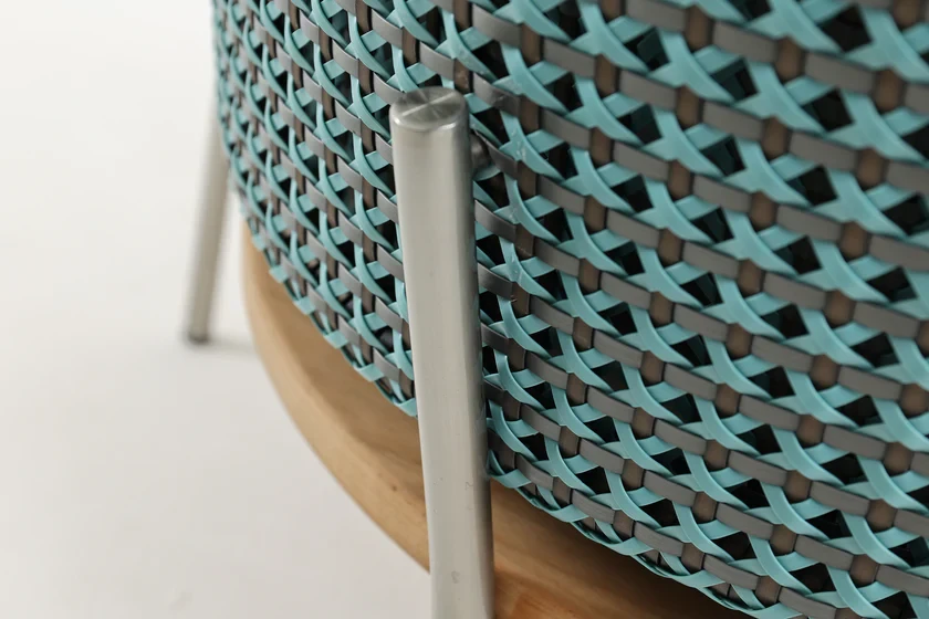 Featuring a tri-tone synthetic rattan wicker weave, the set is as visually striking as it is resilient. Its weather-resistant aluminum frame and teak wood seat base ensure it stands the test of time, even in the harshest conditions. The Sunproof® technical textile cushions add a layer of comfort and practicality with their UV, water, and stain-resistant properties, making upkeep minimal.
